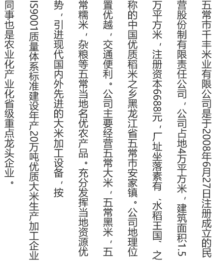 五常市千豐米業有限公司是于2008年6月27日注冊成立的民營股份制有限責任公司 ,公司占地面積40000平方米,建筑面積15000平方米,注冊資本6688萬元,廠址坐落于素有“水稻王國”之稱的黑龍江省優質稻米之鄉黑龍江省五常市安家鎮,地理位置優越,交通便利。 公司主要經營五常大米、五常黑米、五常糯米、五常粥米,雜糧等五常當地名優農產品,充分發揮當地資源優勢,引進現代國內外先進的大米加工設備,按ISO9001質量體系標準建設年產20萬噸優質大米生產加工企業,同時也是黑龍江省農業產業化省級重點龍頭企業。 公司擁有設備技術一流的稻米品種研發機構,在五常市志廣鄉、龍鳳山鄉和安家鎮一帶擁有38萬畝有機、綠色生態水稻種植基地,其中有機水稻種植面積21390畝,良好農業認證種植面積17260畝,綠色水稻基地33萬畝,大米年產量約20萬噸,銷售網絡覆蓋全國二十余個省、市、自治區。